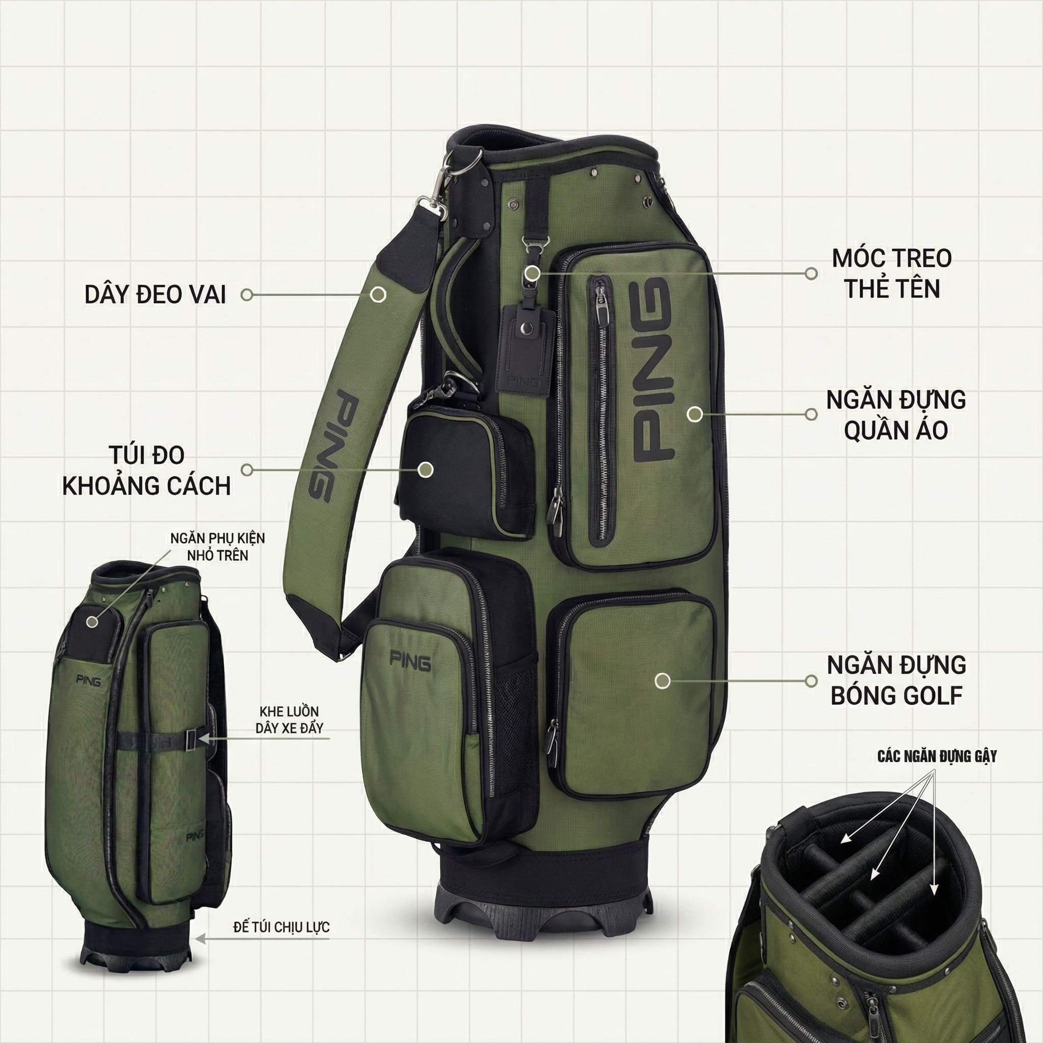 Túi Gậy Golf Vải Dù Chống Nước SC NX1 | PING được thiết kế theo tiêu chuẩn của một túi golf chuyên dụng, tối ưu trải nghiệm cho golfer trên sân. Sản phẩm tích hợp đầy đủ các ngăn tiện ích như: ngăn đựng quần áo, ngăn đựng bóng, ngăn phụ kiện… giúp bạn mang theo đầy đủ vật dụng cần thiết cho một vòng golf 18 hố một cách gọn gàng và khoa học.